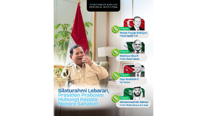 “Setelah bermalam takbiran di Sumatra Utara, Salat Idulfitri di Aceh, serta halal bihalal bersama masyarakat di Istana Merdeka, Jakarta, dalam beberapa hari di suasana Idulfitri ini Presiden Prabowo juga melaksanakan silaturahmi melalui sambungan telepon dengan para pemimpin negara Muslim,” ujar Sekretaris Kabinet, Teddy Indra Wijaya dalam keterangan tertulisnya, pada Minggu, 22 Maret 2026.