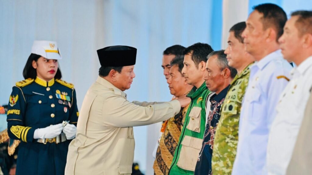 Presiden Prabowo Subianto menganugerahkan Tanda Kehormatan Republik Indonesia kepada sejumlah tokoh dan pelaku di bidang pertanian dan pangan dalam acara Panen Raya dan Pengumuman Swasembada Pangan Nasional Tahun 2025 yang digelar di Desa Kertamukti, Kabupaten Karawang, Provinsi Jawa Barat, pada Rabu, 7 Januari 2026. Foto: BPMI Setpres/Laily Rachev